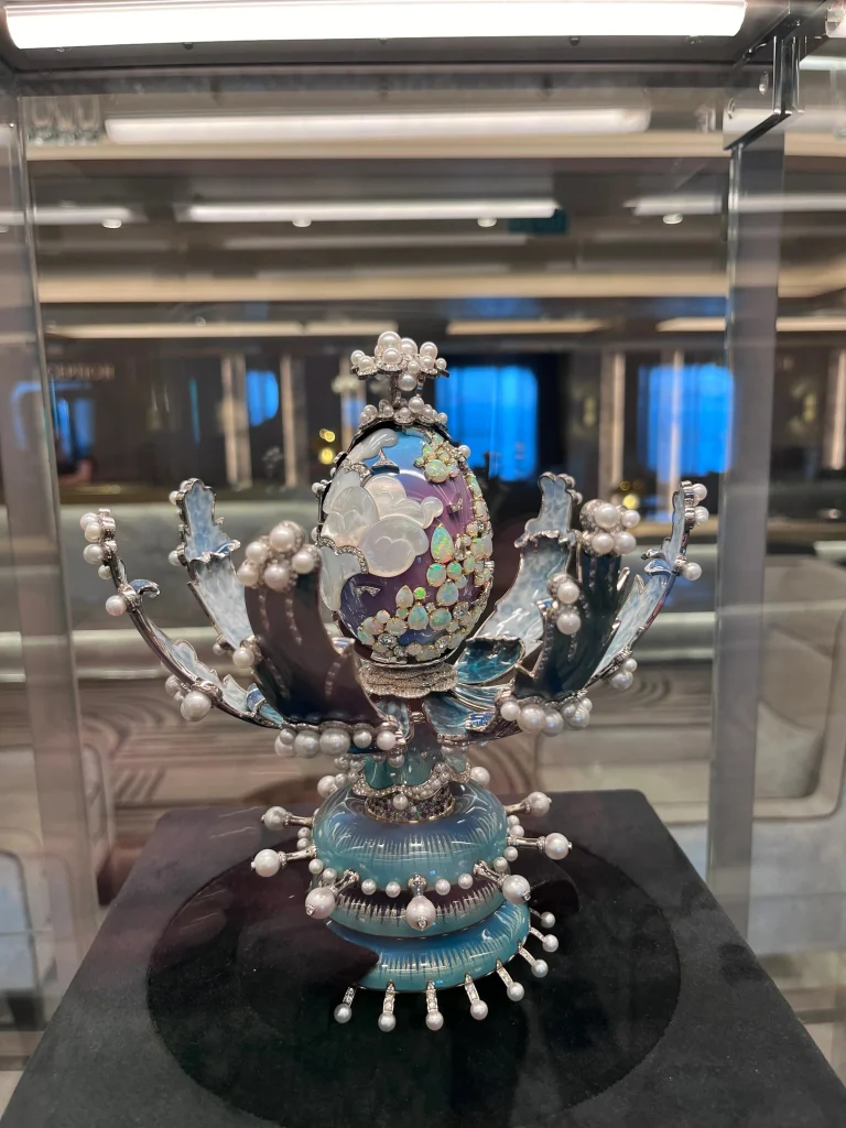 There isn’t really a wow factor when you step onboard Grandeur into the large reception lounge filled with formal grey velvet sofas centred around an almost unnoticed Fabergé egg in a glass case (just one of the 1,600 pieces of incredible art onboard), but it oozes cool sophistication.