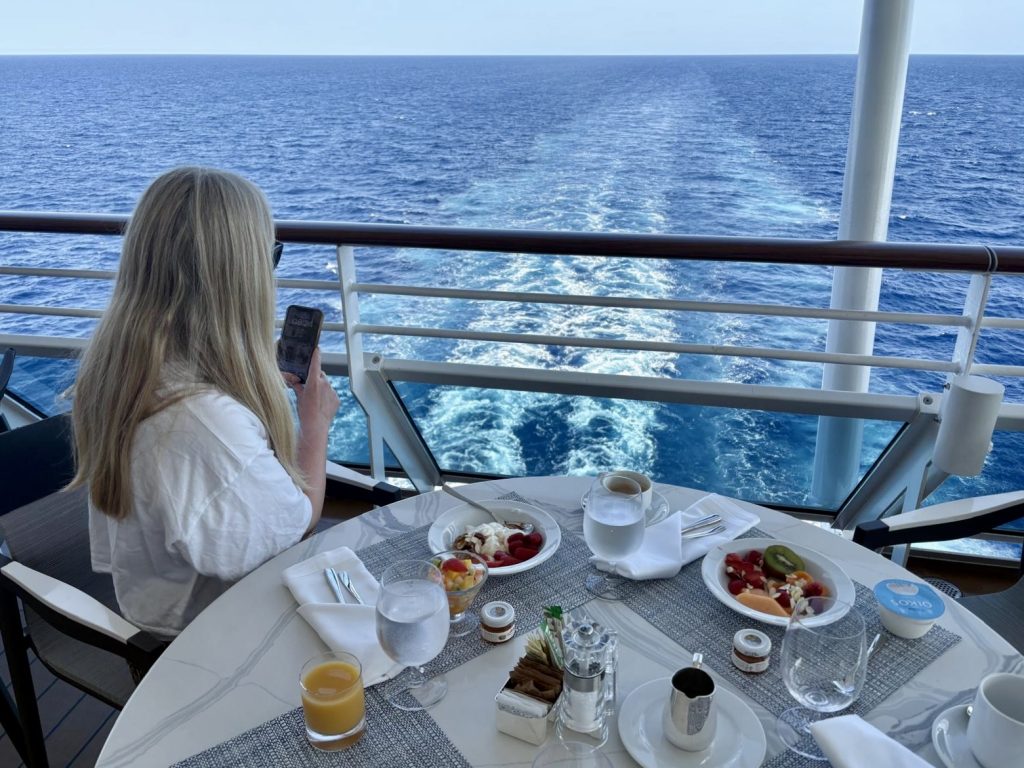 My well-appointed and super stylish Penthouse Suite, on deck 11, right opposite the Executive Lounge, had a boutique feel, with a large terrace, walk-in wardrobe and bathroom with double vanity basins. I loved the blue motion-activated nightlight and bedside USB ports.